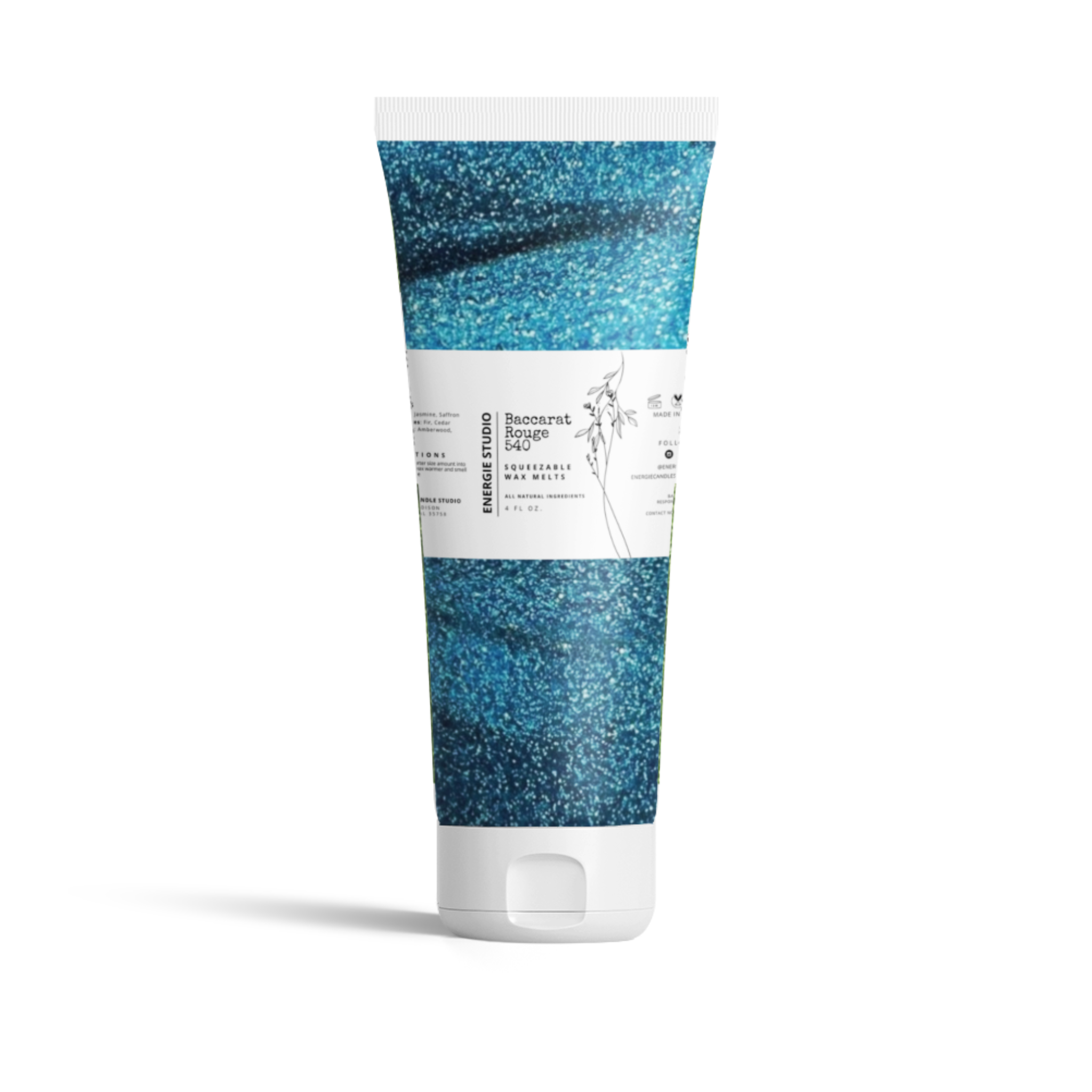 A coconut-beeswax blend eco-friendly squeezable wax melt. Our Baccarat Rouge 540 Luxe Wax Melt is hand-poured into an 4oz BPA-Free Squeezable plastic tube, each topped with lots of pretty bling.