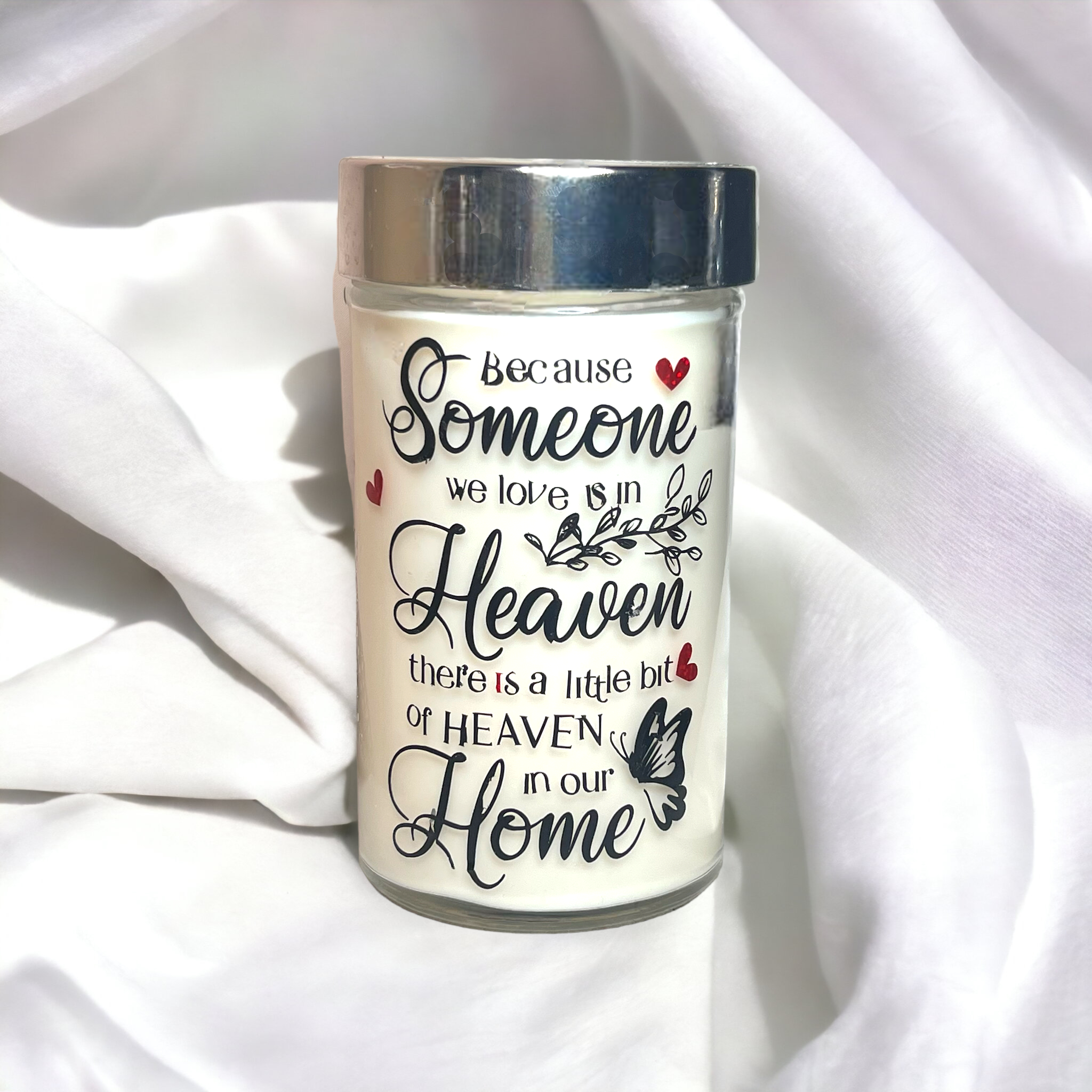 In Loving Memory is on every candle and is larger than most of our candles. Due to the customized label we use a beautiful tall glass with a chrome screw-top lid. Also available in light bronze lid.